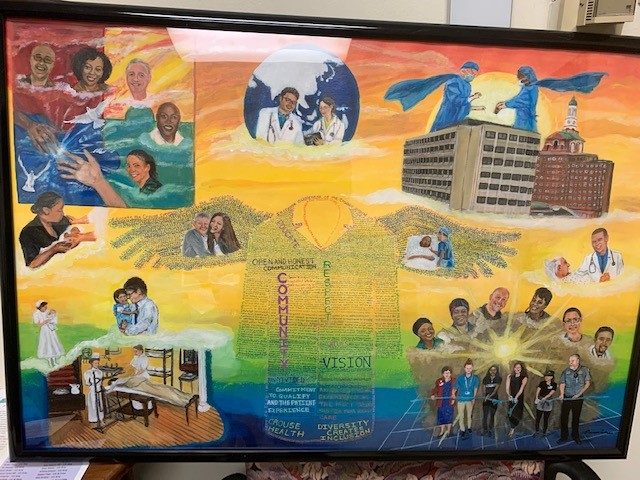 The DEI&B Committee saw an opportunity to highlight the diverse workforce in the organization. Through the fundraising support of the Crouse Health Foundation and board member Melvin Stith, PhD, the committee commissioned five local artists to contribute works of art for a mural displayed on the wall in the basement level of the Irving building.