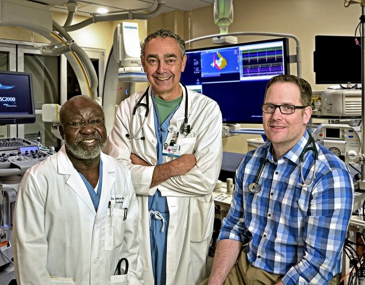 Crouse cardiologists Kwabena Boahene, MD, Joseph Battaglia,MD and Matthew Gorman, MD are the first in Syracuse to implant the Watchman in AFib patients.