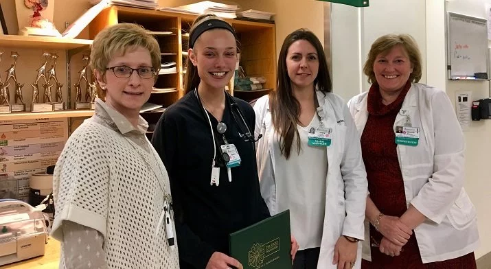 Cardiac Services Administrator Lynne Shopiro, far left, Nurse Manager Diana Dixie and Vice President of Education and Nursing Support Rhonda Reader presented Kendra with her award.